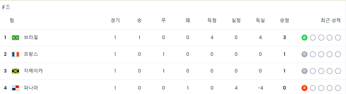 | 1 | 브라질 | 1 | 1 | 0 | 0 | 4 | 0 | 4 | 3 |