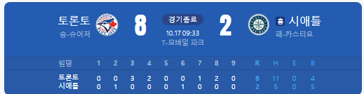시애틀은 구단 최초의 월드시리즈 진출을 노리고 있었고, 토론토는 오랜만에 정상권 경쟁을 이어가고 있습니다.