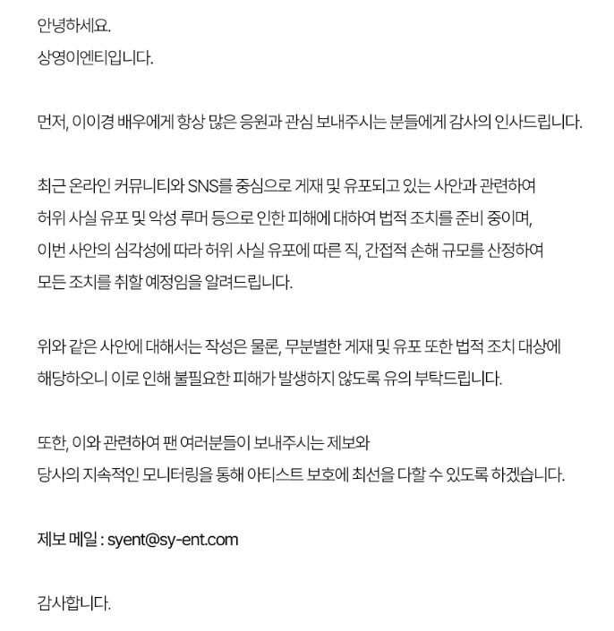 • 작성·게재·유포 등 일체 행위에 대해 강경 대응을 준비 중이며, 필요한 모든 법적 조치를 취한다.
