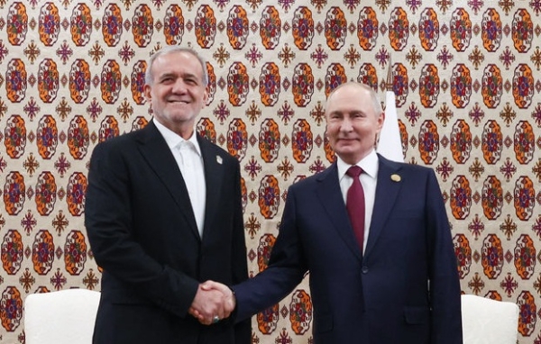 마수드 페제시키안 이란 대통령(왼쪽)과 블라디미르 푸틴 러시아 대통령이 2025년 12월 투르크메니스탄 아시가바트에서 접견하며 기념 촬영을 하고 있다. 사진=AP통신