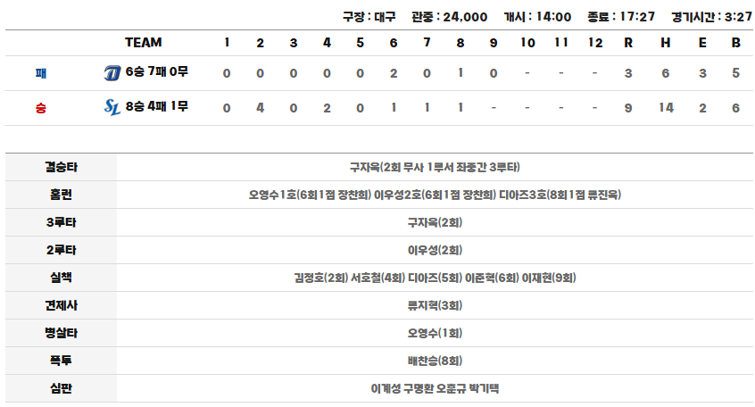 대구 삼성 라이온즈 파크에 무려 24,000명(만원 사례!)이 몰린 가운데 삼성이 NC를 9대 3으로 대파했어요! 경기 시간만 3시간 27분, 양 팀 합산 20안타가 터지는 타격전 속에서 삼성이 확실하게 우위를 점했답니다.