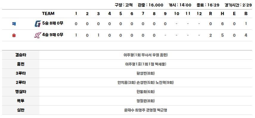 고척 스카이돔에 16,000명이 찾은 이 경기는 오늘 5경기 중 가장 치열하고 긴장감 넘치는 투수전이었어요! 키움이 롯데를 2대 0으로 완봉하며 2시간 29분이라는 가장 짧은 경기 시간을 기록했답니다.