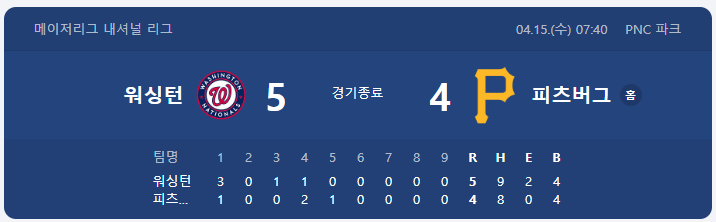 | ⚾ ⑤ 내셔널스 5 : 4 파이리츠 — 미첼 파커의 시즌 첫 승 |