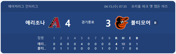 | ⚾ ① 다이아몬드백스 4 : 3 오리올스 — 메릴 켈리의 복귀 첫 승! |