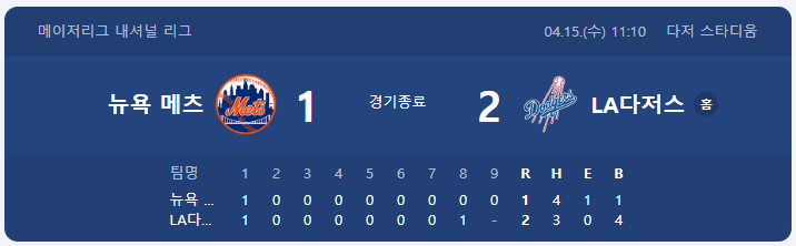 | ⚾ ⑮ 메츠 1 : 2 다저스 — 야마모토 7.2이닝 1실점, 에이스의 품격! |