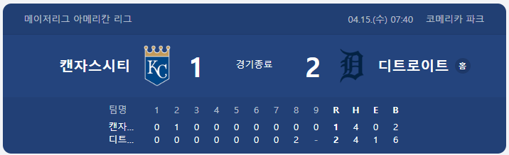 | ⚾ ③ 로열스 1 : 2 타이거스 — 투수전 끝 짜릿한 끝내기! |