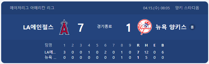 마이크 트라웃이 2경기 연속 홈런을 포함해 에인절스 타선이 총 5개의 홈런을 양키스에 안겼습니다! 양키스 선발 라이언 웨더스가 시즌 2패째를 당했고, 에인절스의 리드 데트머스가 시즌 첫 승을 챙겼어요. 양키스 타선이 5안타 1득점에 그치며 힘없이 무너졌습니다. 에인절스는 최근 상승세를 타며 9승 9패 5할을 기록 중이에요.