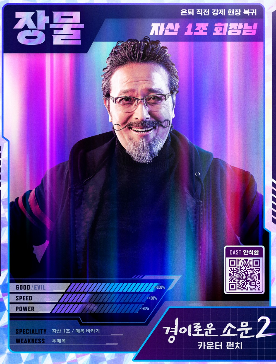 ![]() ![]() 최장물 (안석환) “기대해라.. 나 최장물이 맘 단디 먹고 준비했다.. 언놈의 악귀도 이 최장물이 장비빨엔 못 당한다 안했나!” 여전히 카운터들의 든든한 재정적 지원을 담당하고 있는 장물 회장. 요즘 들어선 부쩍 현장을 뛰는 일도 많아졌다. 형사짓 한답시고 자꾸 자리 비우는 모탁이 때문이기도 하고- 요즘 따라 부쩍 센치해진 추여사 마음 관리를 위해서기도 하고- 중국에서 기어들어온 무시무시한 악귀 새끼들이 만만치 않기 때문이기도 하다. 새파란 카운터들을 따라 뛰려니 삐끗, 몸은 예전처럼 따라주지 않지만, 빠른 판단력과 오랜 경험, 거기다 재력까지 과시하며 제 몫을 제대로 해내는 장물. 살면서 온갖 산전수전 다 겪은 장물이 바라는 건 딱 하나- 해가 좋은 날, 카운터들과 함께 새파란 바다를 보며 마시는 시원한 맥주 한 잔? 모두가 무사히 카운터 생활을 마치고 은퇴하는 것이다!! 만일... 만일 그렇지 못할 것 같은 상황이 온다면? “...어른이 돼 갖고... 뭐라도 하나 해줘야 하지 않겠나.” |