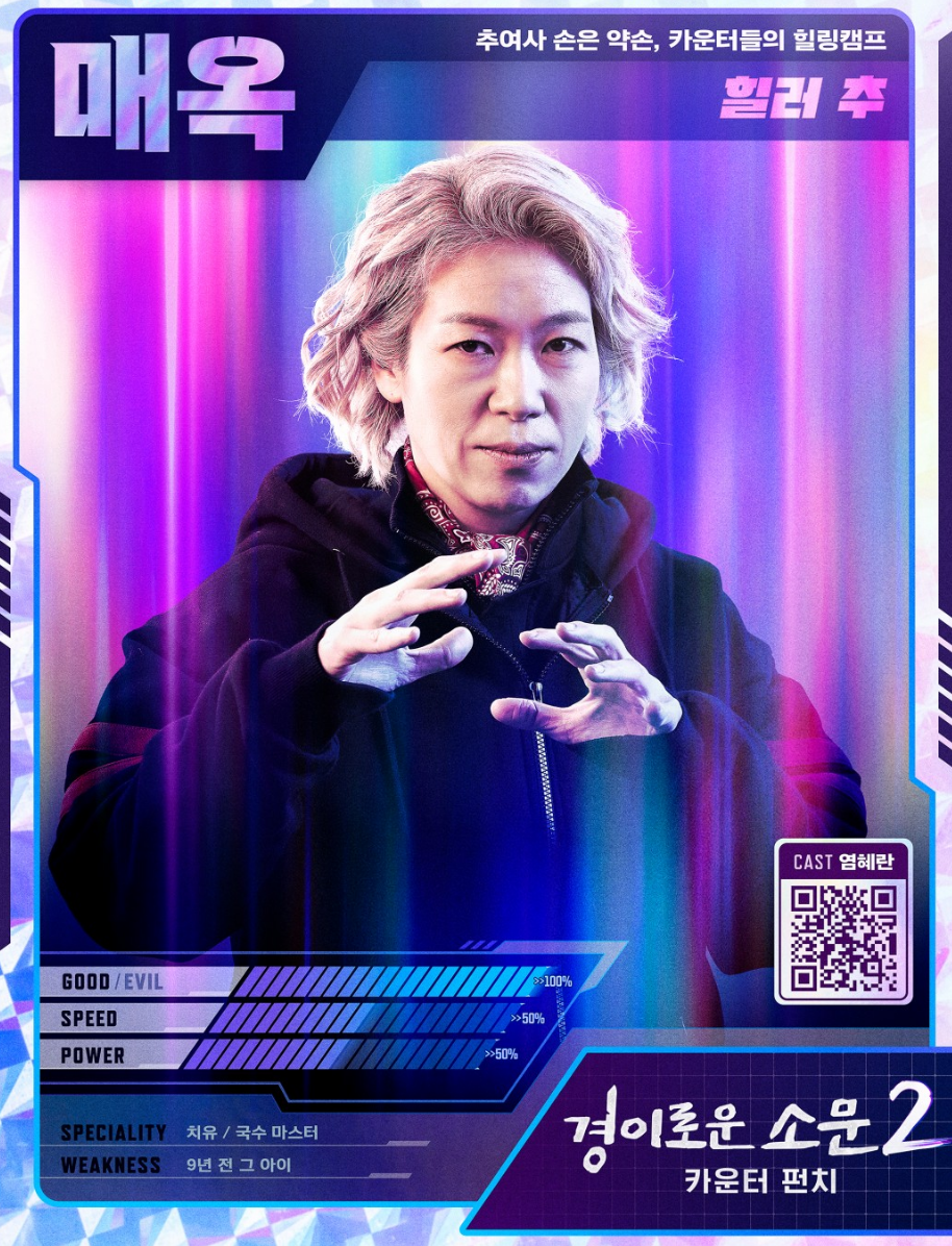 ![]() ![]() 추매옥 (염혜란) “걱정하지 마.. 우리가 반드시 구할 거니까.. 모두를 다시 만날 날이.. 반드시 있을 거야. 약속할게, 내가.” 카운터로서의 지난 10년의 삶은 만만치 않았다. 그럼에도 가장 힘든 건, 함께 뛰던 친구들을 먼저 보내는 일.. 동료들의 죽음에 비통한 매옥의 몸도 확실히 예전같지 않은데.. 하지만 싸움은 힘으로만 하는 게 아니다! 관록과 기세! 누구보다도 열심히 훈련에 매진하며 걸크러시를 맘껏 발산하는 추매옥! 여전히 카운터들에게 단 하나뿐인 치유 능력자인 매옥, 그러나 매옥이 치유하는 건 몸의 상처뿐만이 아니다. 마음에 난 상처까지도 따뜻하게 품어내는 그녀는 카운터들의 정신적 지주. 추여사표 뜨끈한 국수 한 그릇엔, 제아무리 얼어붙은 마음도 풀어지고 만다. 동료의 죽음과 강력한 악귀의 등장으로 싱숭생숭하던 그녀 앞에 뜻밖의 인연이 나타난다. 서툴기만 했던 초보 카운터 매옥이 첫 임무를 수행하던 그날, 악귀의 공격으로 위험에 처한 매옥을 구하려 몸을 던졌던- 선한 아이, 재열. 매옥 대신 칼에 맞고 쓰러진 재열은 매옥에게 카운터로서의 사명감을 심어준 아이이자, 매옥의 힐러 능력을 처음으로 알게 해준 아이였다. 그런데 그랬던 재열이 지금, 악귀만도 못한 양아치가 되어있다. ‘너.. 도대체 너한테 무슨 일이 있었던 거냐.’ 변해버린 재열의 모습에 화가 나기도, 허탈하기도 한 매옥이지만- “인생 길다드라-!! 살날이 더 많으니, 너 아직 안 늦었다!” 추매옥, 다시 만난 재열을 다시 구할 수 있을까? |