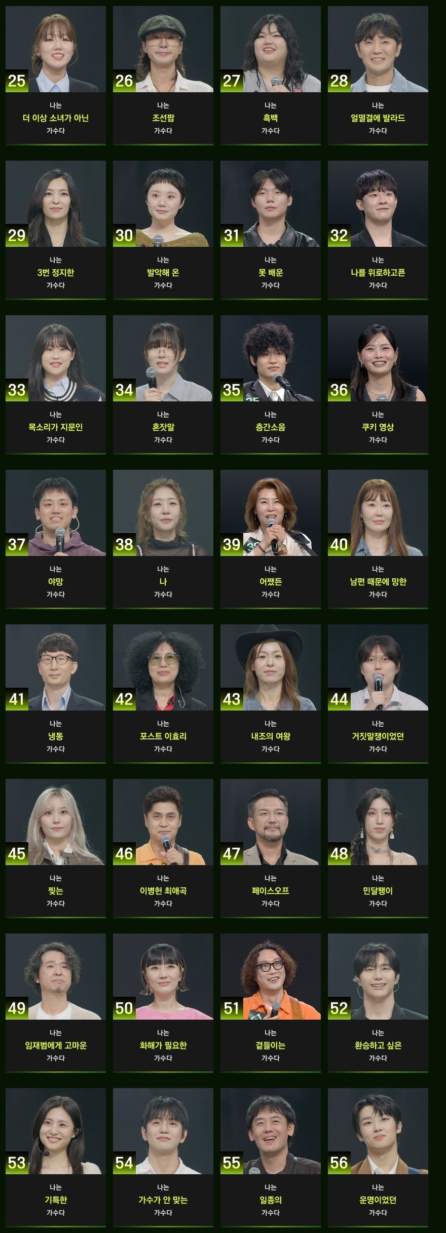 ‘나는 싱어게인 키즈다’, ‘나는 포스트 이효리 가수다’, ‘나는 화해가 필요한 가수다’ 등 개성 강한 문구들이 등장하며 본선 진출자 한 명 한 명에게 자연스럽게 시선이 몰렸습니다.