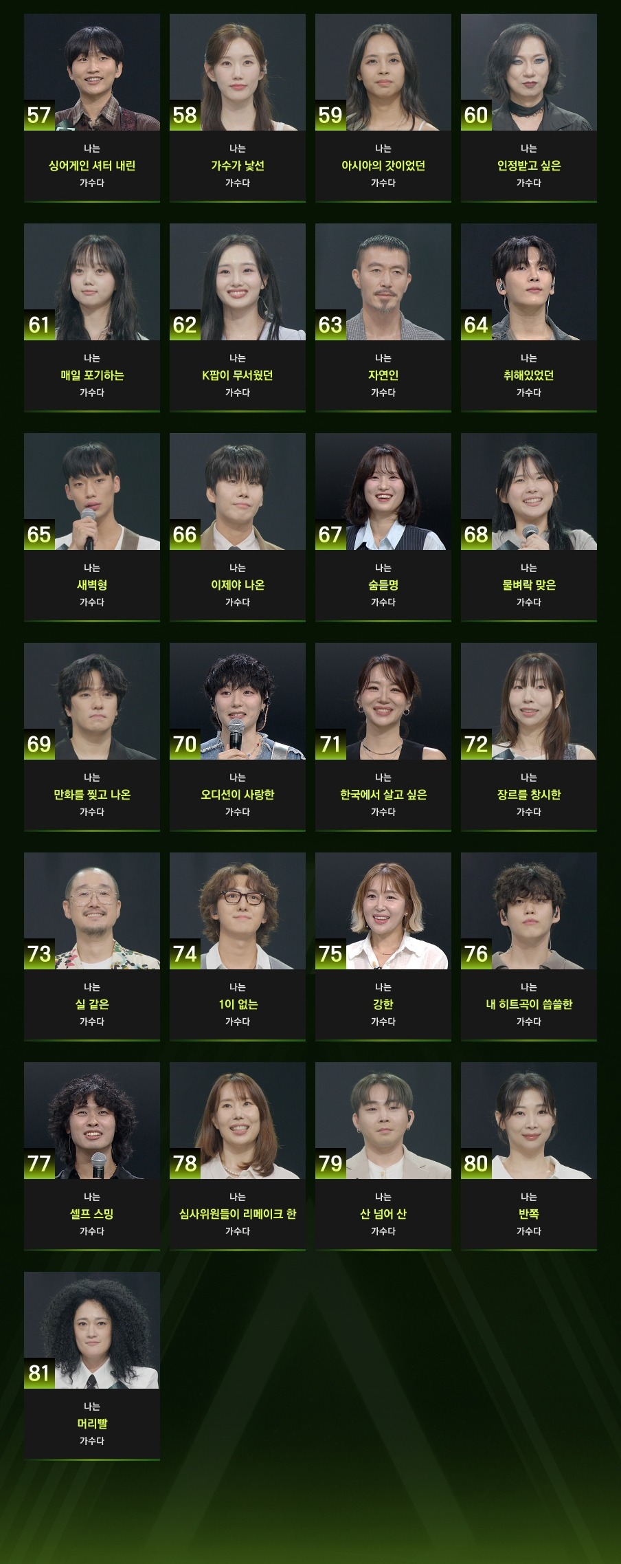 ‘싱어게인4’ 제작진은 10월 1일, 치열한 경쟁률을 뚫고 본선에 진출한 81인의 참가자 명단과 얼굴, 한 줄 소개 문구를 공개했습니다.