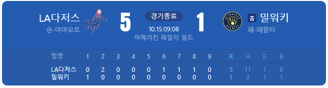 내셔널리그 챔피언십시리즈(NLCS) 2차전에서 다저스가 5-1로 이겼다. 점수판만 보면 큰 격차는 아니지만, 흐름은 다저스가 초반을 제외하고 대부분 쥐었다. 초구 피홈런으로 뒤졌지만 2회 곧바로 뒤집었고, 중후반에 추가점을 쌓으며 밀워키의 추격을 끊었다. 시리즈는 2-0이 되었고 장소는 밀워키에서 LA로 이동한다.