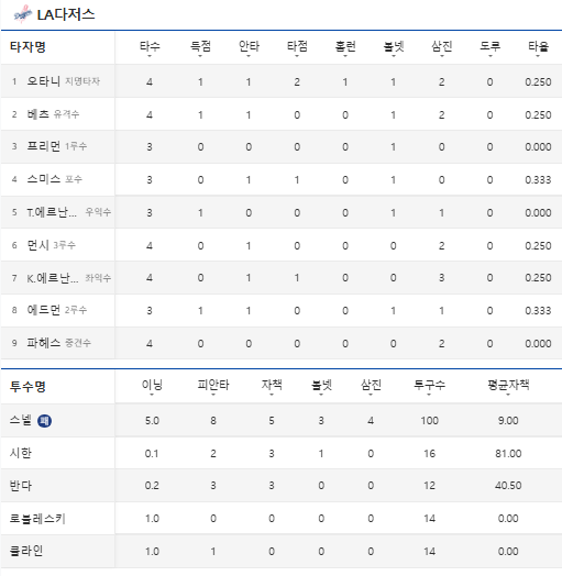 셋째, 자칫하면 분위기를 반전시킬 수 있었던 7회 도루 및 홈런으로 추격은 했지만 이미 벌어진 격차가 컸습니다. 예컨대 Shohei Ohtani의 홈런도 나왔지만 이미 승부의 흐름이 넘어간 뒤였습니다.