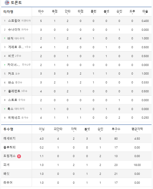 - 그 외에도 Alejandro Kirk의 홈런이 이어지는 등 대형 장타가 혼재했습니다.