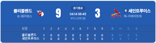 | ⚾ 8. 클리블랜드 가디언스 9 : 3 세인트루이스 카디널스 |