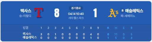 | ⚾ 9. 텍사스 레인저스 8 : 1 애슬레틱스 |