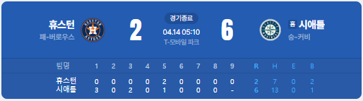 | ⚾ 1. 휴스턴 애스트로스 2 : 6 시애틀 매리너스 |
