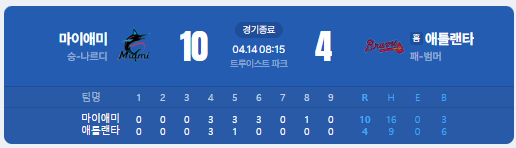 | ⚾ 6. 마이애미 말린스 10 : 4 애틀랜타 브레이브스 |